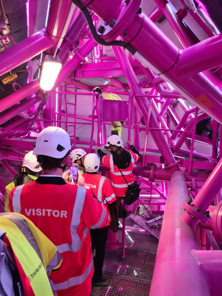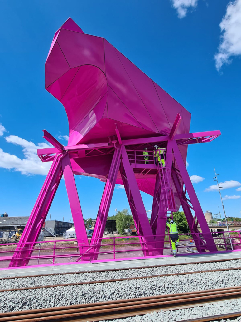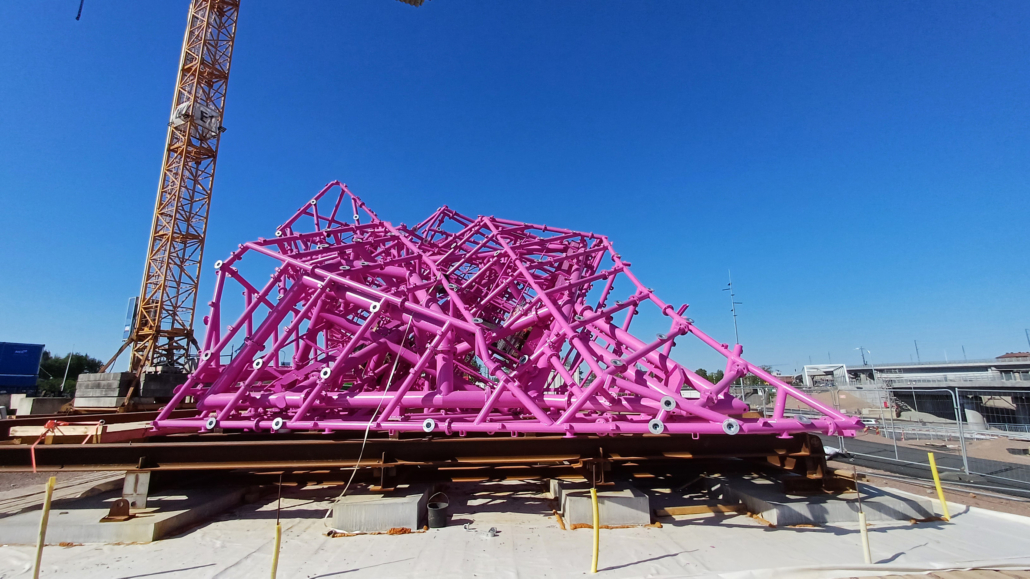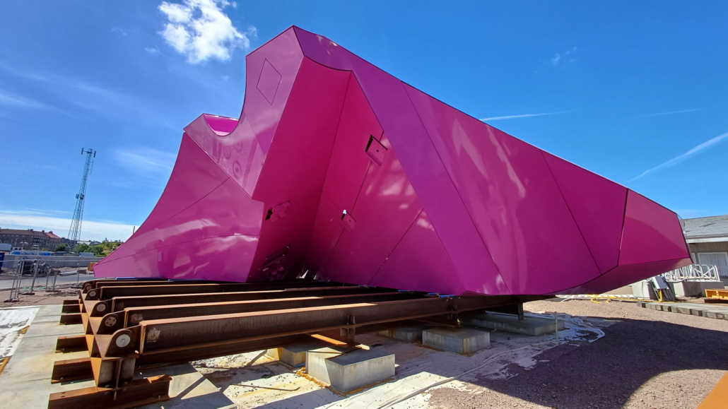 Für die komplexe Form wurden 71 Aluminium-Elemente hochpräzise gefertigt und über 680 bewegliche Lager mit der Stahlkonstruktion verbunden, um die thermisch bedingten Längsausdehnungen der Außenverkleidung ohne zwanghafte Einspannungen zu ermöglichen. Die Konstruktion ist feuerverzinkt, wetterfest beschichtet und der leuchtende Magenta-Ton zusätzlich mit Graffiti-Schutz versiegelt – für maximale Dauerhaftigkeit.