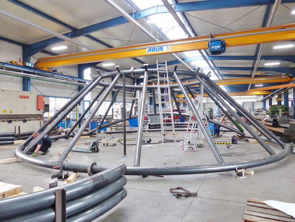 Die Stahlkonstruktion umfasst eine Vielzahl individuell gefertigter Bauteile, die gemeinsam ein tragfähiges und zugleich filigran wirkendes Gesamtsystem bilden. Die hohe Komplexität der Geometrie erforderte eine besonders präzise Planung und Fertigung, um die Form des Daches exakt umzusetzen und gleichzeitig die Anforderungen des denkmalgeschützten Bestands zu berücksichtigen.