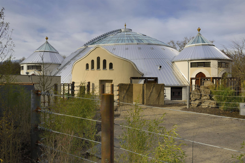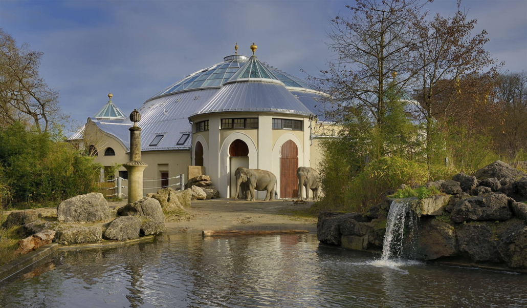 Das Elefantenhaus im Tierpark München Hellabrunn ist ein denkmalgeschütztes Bauwerk, dessen charakteristische Dachlandschaft im Rahmen einer umfassenden Stahl-Glas-Konstruktion neu interpretiert wurde. Die neue Dachstruktur bildet eine prägnante, ovale Kuppelform, die sich harmonisch über das historische Gebäude legt und dessen architektonische Wirkung deutlich stärkt.