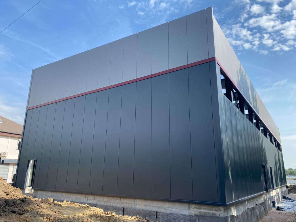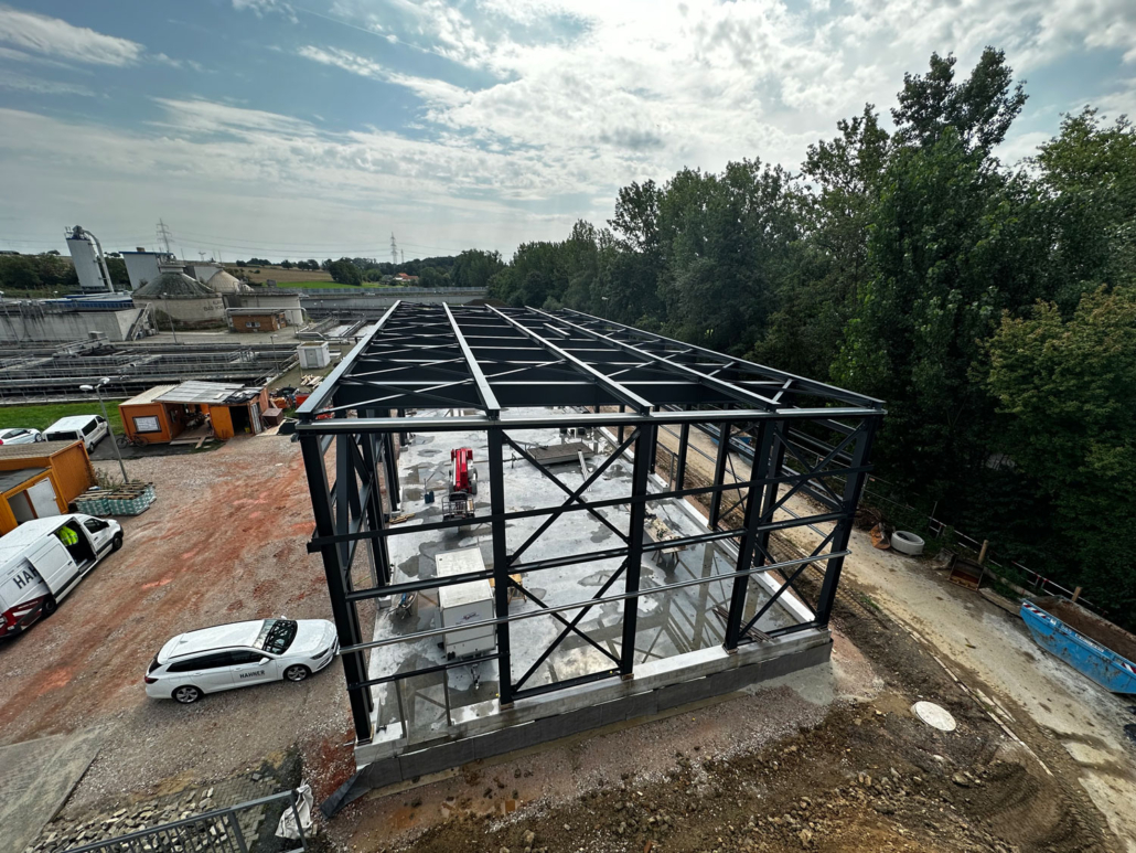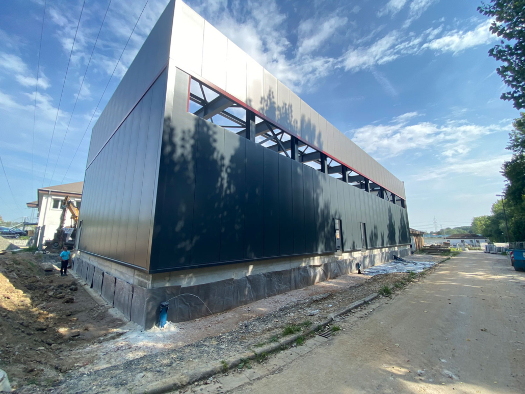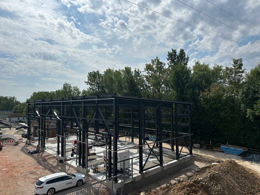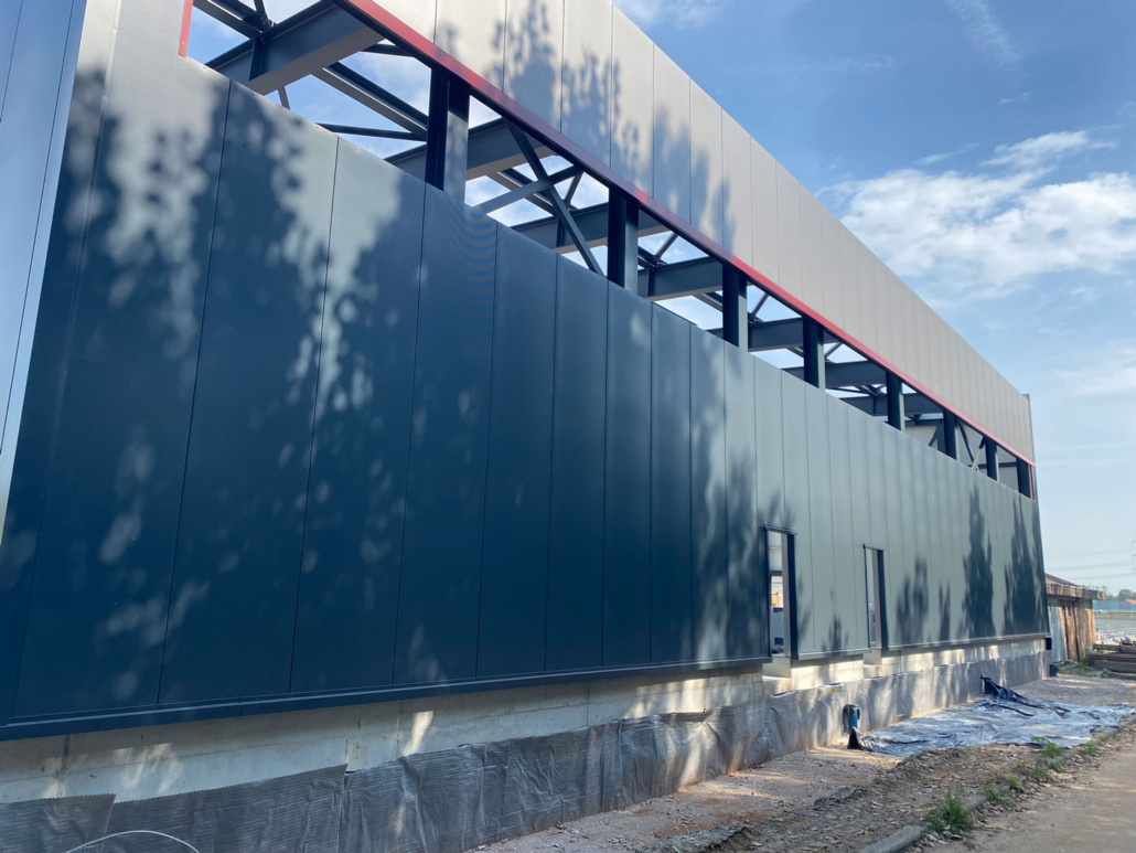 Für die Fahrzeughalle in Ober-Eschbach wurden rund 50 t Stahl in unserem Werk geplant, gefertigt und vor Ort montiert. Die Gebäudehülle mit etwa 440 m² Sandwichelementen sorgt für ein modernes, funktionales Erscheinungsbild.