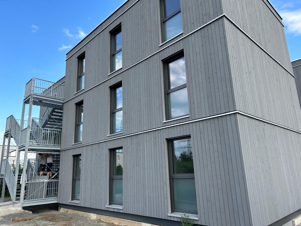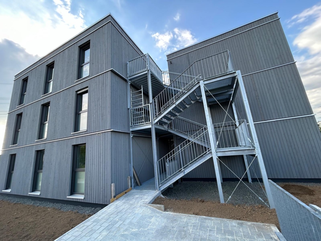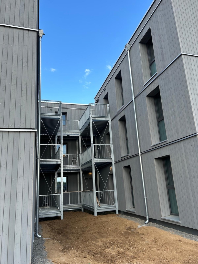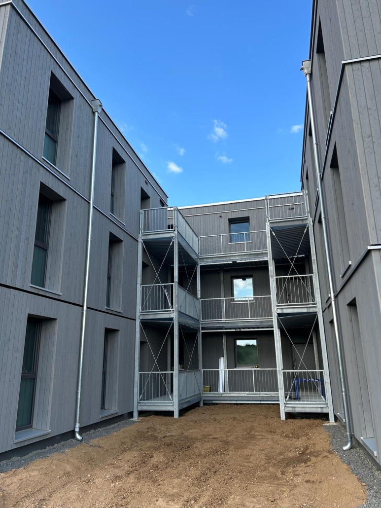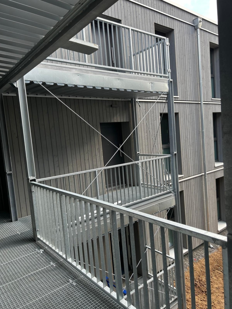 Die Laubengänge bestehen aus verzinktem Stahl (S235) und robusten Gitterrosten, die sowohl Langlebigkeit als auch Sicherheit gewährleisten. Besonderes Augenmerk lag auf einer präzisen Fertigung und Montage, um die Laubengänge exakt an die Holzmodulgebäude anzupassen und eine stabile Verbindung zu schaffen.